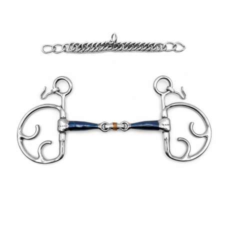 The Kimblehook can be described as a fixed ring with the possibility to add leverage when you need it. The further down you place your rein; the more pressure will be added and divided between chin, poll, and mouth. The stable feeling Kimblehook creates can be good for fuzzy and worried horses that gets strong, unbalanced and hard to turn. The Kimblehook puts the pressure further down in the mouth which can help a horse that gets too high in the neck. Kimblehooks are always used together with a chain or strap behind the chin.